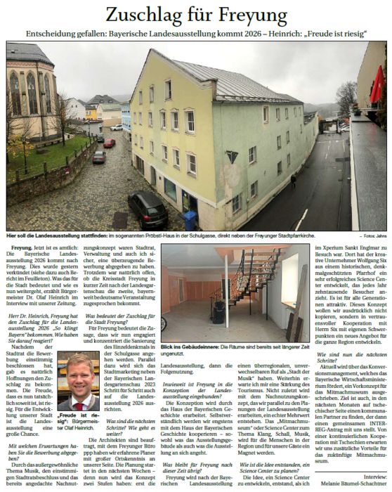 Dass die Stadt Freyung für eine Bayerische Landesausstellung zum Thema Musik bestens aufgestellt ist, stellte Dr. Olaf Heinrich, 1. Bürgermeister der Stadt Freyung und Bezirkstagspräsident von Niederbayern, dar: „In den letzten Jahren hat sich unsere Stadt mit der „Volksmusikakademie in Bayern“, mit „FreYbühne“ und „FreYklang-Konzerten“ einen Namen gemacht. Wir wollen uns mit der Bayerischen Landesausstellung und der geplanten Folgenutzung des innerstädtischen Einzeldenkmals weiterhin überregional als musikaffine rührige Kleinstadt mit hoher Lebensqualität etablieren und präsentieren. Gerne werden wir 2026 ein guter Gastgeber für Musikschaffende – Laien wie Profis –, sowie Geschichts- und Kulturinteressierte aus ganz Bayern und darüber hinaus sein, damit die facettenreiche klingende Geschichte des Freistaates für sie mit allen Sinnen erlebbar wird.“