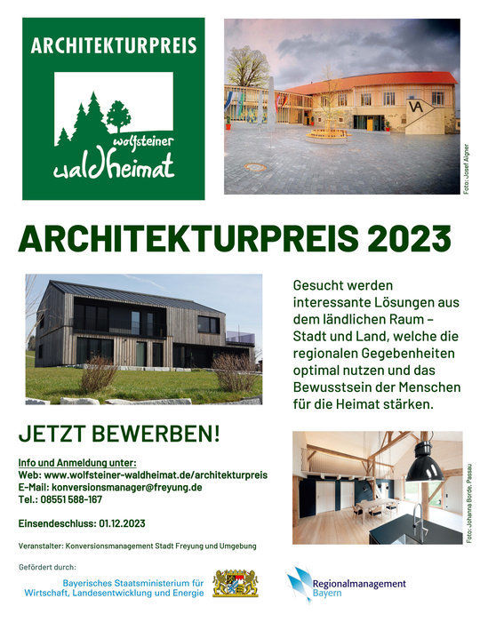 Das Konversionsmanagement der Stadt Freyung und Umgebung lobt heuer in Zusammenarbeit mit den Gemeinden der Wolfsteiner Waldheimat zum dritten Mal den Architekturpreis der Wolfsteiner Waldheimat aus. Mit dem Architekturpreis zeichnen wir regionale Baukultur und gleichzeitig gelungene moderne Architektur aus. Mit der Auszeichnung und der Publikation der Projekte möchten wir insbesondere Besitzer von Altbauten inspirieren, alte Bausubstanz zu erhalten und mit neuem Leben zu füllen.