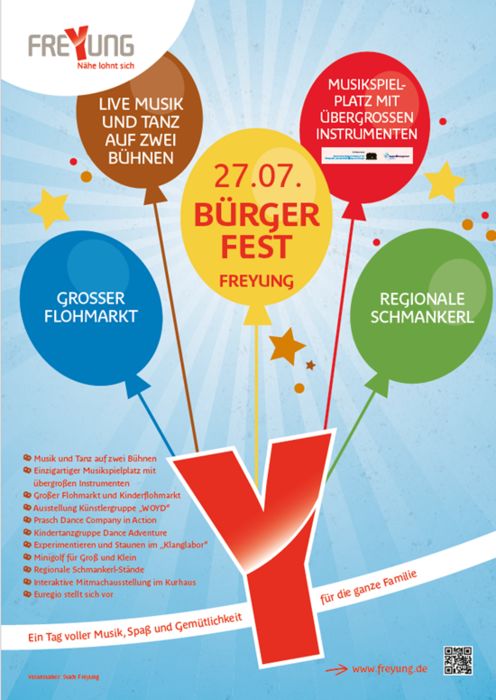 Am Samstag den 27.07. Ab 7:00 Uhr findet in der Freyunger Innenstadt wieder das traditionelle Bürgerfest statt. Das bedeutet für die Besucher einen ganzen Tag lang Gemütlichkeit und Unterhaltung. Bei Musik und Tanz auf zwei Bühnen ist für jeden Geschmack etwas dabei. Zahlreiche Aussteller zeigen ihre Waren und an jeder Ecke gibt es regionale Schmankerl. Für glänzende Kinderaugen sorgen spezielle Angebote für die kleinen Besucher! Die Künstlergruppe „WOYD“ ist dafür bekannt, ihr Können auf beeindruckende Weise zu präsentieren, was den Besuchern die Möglichkeit gibt, Kunst hautnah zu erleben. Am oberen Stadtplatz sorgt die Freiwillige Feuerwehr Freyung für das leibliche Wohl und öffnet am Abend die beliebte Wein-Bar. Zusätzlich bietet der TV Freyung Kulinarisches am unteren Stadtplatz an und verwöhnt die Besucher mit leckeren Cocktails am Abend. Außerdem findet in Freyung wieder der große Flohmarkt mit Kinderflohmarkt statt.