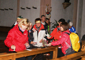 Nach dem Gottesdienst und Pilgersegen durch Pfarrvikar Johannes Spitaler in der Stadtpfarrkirche Maria Himmelfahrt in Freyung wurde die Pilgergruppe um Angela Wimmer von Christian Kilger, Leiter der Touristinformation Freyung und Renate Liebl, Freyunger Pilgerwegbeauftragte, mit einem kleinen Heft für Pilgernotizen (hier können die Pilger ihre ganz persönlichen Eindrücke und Erlebnisse festhalten) und dem Pilgerstempel verabschiedet. Auch kleine Steine aus dem Freyunger Saußbach begleiten sie. Einerseits symbolisieren sie das verbindende VIA NOVA-Element der Sitzsteine und andererseits kann jeder Pilger damit seine persönlichen Wünsche, Freude oder Sorgen auf dem Weg ablegen, ihn nach Schweiklberg mitbringen, oder auch als Andenken mit nach Hause nehmen.