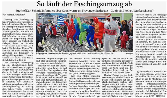 Ferner ist jede Art von Pyrotechnik verboten, d.h. auch das Werfen von Schweizer Krachern, auch von Seiten der Besucher. Außerdem appellierte Schmid, mit dem „Wurfmaterial“ zuschauerfreundlich umzugehen und es nicht als „Wurfgeschosse“ zu missbrauchen. Es gibt nämlich natürlich wieder jede Menge Süßes umsonst, gesponsert von der Stadt Freyung.